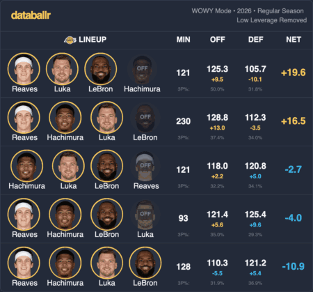 4人全員が同時にコートに立つラインナップよりも、この4人のうち3人だけで構成したラインナップの方が、はるかに良いパフォーマンスを示している。
