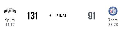 サンアントニオ・スパーズが131-91でフィラデルフィア・セブンティシクサーズに勝利し、連敗を1で止めた。
