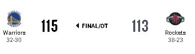 延長戦残り約30秒、3点ビハインドのHOUはデュラントがフリースローを2本決めた。しかしGSWは残り5.3秒にディアンソニー・メルトンのティップインレイアップで115-112とし、接戦を制した。