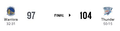 第4クォーター終盤、99-97とOKCの2点リードで迎えた残り42.4秒、ギルジャス・アレクサンダーがドレイモンド・グリーンのチェックを越えて決定的な3ポイントシュートを沈めて点差を5に広げ、そのままOKCが逃げ切った。なお、GSWはこの試合のフィールドゴール成功率が40.9パーセントに抑え込まれた。