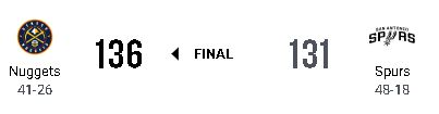ニコラ・ヨキッチが31得点20リバウンド12アシスト、ジャマール・マレーが39得点を記録し、DENがSASに136-131で勝利した。