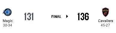 第4クォーター残り9分余りでCAVは114-103と二桁リードを築いたが、終盤にORLが粘りを見せて点差を縮められた。しかし残り13.7秒、ミッチェルが値千金のジャンプシュートを沈めて136-131で接戦を制した。