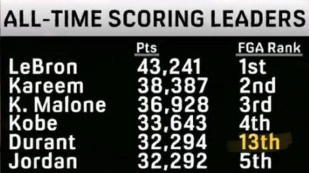 答えは3ポイントだ。時代の違いだよ。20年後にはこれらのリストは全く違って見えるだろうし、デュラントの得点率が標準になるだろう。