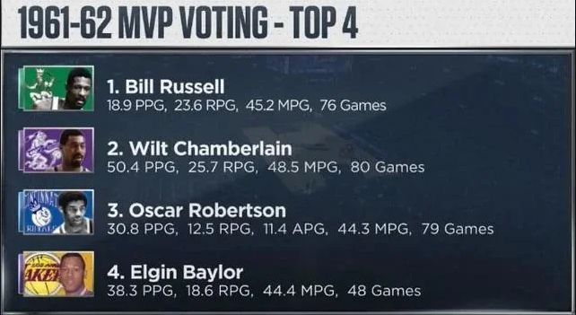 ↑1961-62シーズンには生きていなかったから純粋な疑問なんだけど、ウィルトがあんなスタッツを残したのに、なぜあの年はビルがMVPだったの?