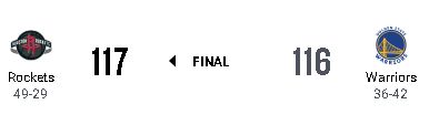 残り20秒、ゲイリー・ペイトン2世がゴールテンディングにより一時逆転となるシュートを決めた。しかし残り11秒、ケビン・デュラントからのパスを受けたシェングンが勝ち越しのレイアップを沈めた。カリーは最後の3ポイントシュートを外し、HOUが接戦を勝ち切って勝利した。