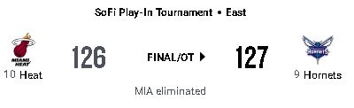 延長残り8.7秒、タイラー・ヒーローが3本のフリースローを全て決めてMIAが1点リードしたが、直後にボールが決勝レイアップを成功させた。最後はブリッジズがダビオン・ミッチェルのレイアップをブロックし、CHAが逃げ切った。