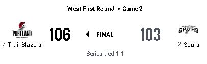 PORが106-103でSASを下し、シリーズ成績を1勝1敗のタイに戻した。