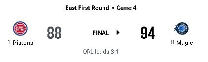 デズモンド・ベインが22得点を挙げ、第8シードのORLが第1シードのDETに94-88で勝利しシリーズ成績を3勝1敗とした。