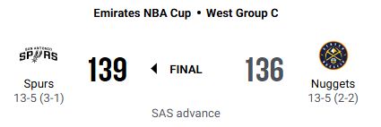 NBA・米国バスケ 【NBA】ウェンビー不在のSASがDENに競り勝ちカップ戦準々決勝進出!ヴァッセル33得点