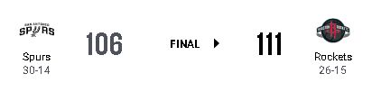 試合前、ウォーミングアップ中に選手がリングを曲げてしまい、交換作業のため試合開始が22分遅れるハプニングがあった。 試合はスパーズが最大16点をリードし、第4クォーター開始時点でも10点差をつけていたが、ロケッツが猛追を見せた。